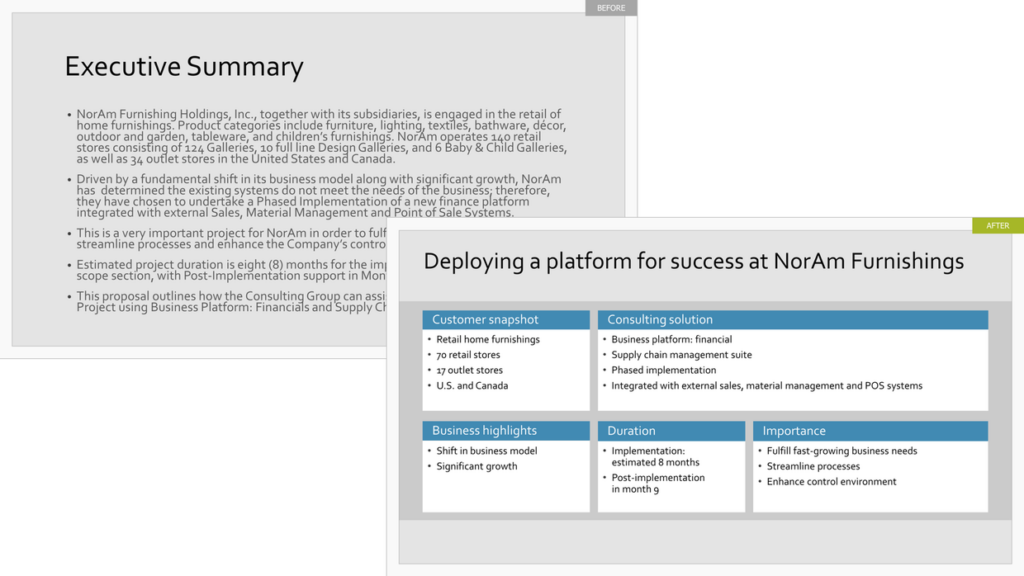Below is a great one-glance example of an executive summary made visual. It is particularly helpful to ‘bucketize’ or group it into segments. Also, highlighting each topic name in a different color helps the viewer sum it up even more quickly. Look at the bottom left vs. the bottom right. When we say ‘at-a-glance’, this is what we mean.