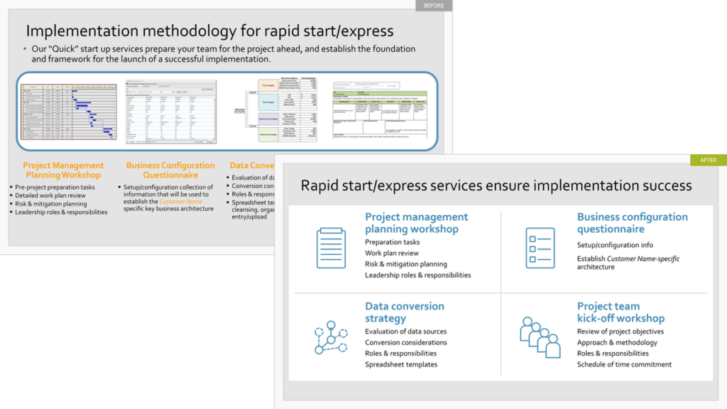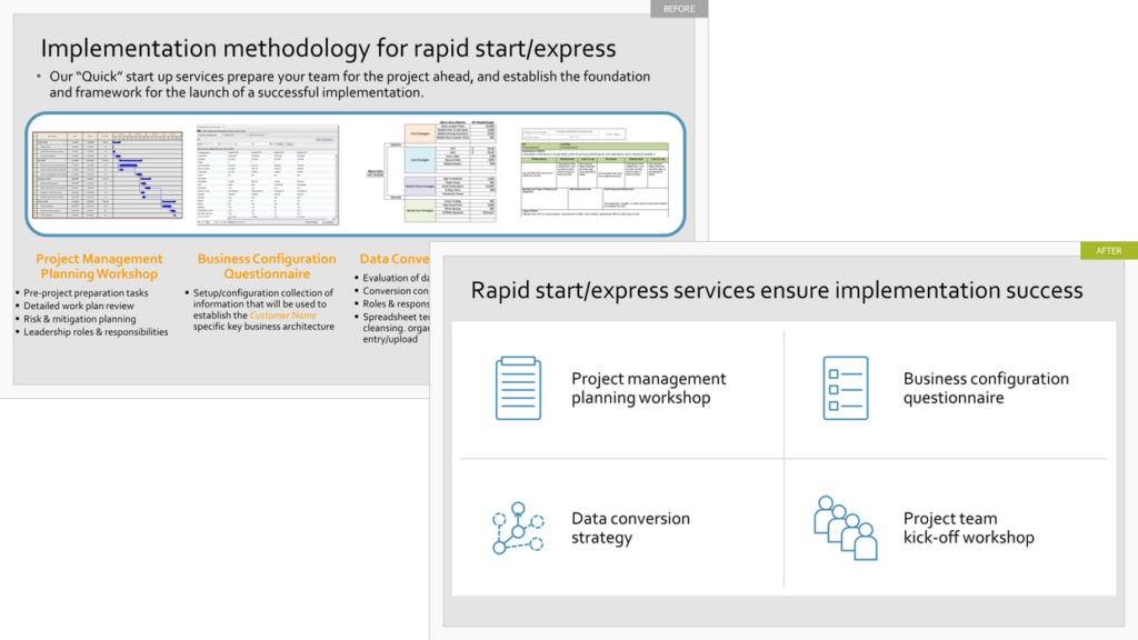 The below examples show extreme netting out and moderate netting out. Only you can determine what absolutely must be kept in. But, we believe that strong editing is critical to holding your audience’s attention. See below how distilling key messages and using simple iconography can transform a slide jammed with words and data. See extreme and moderate versions below.