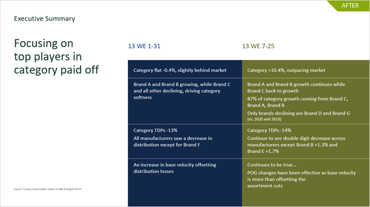 Here’s another example of an executive summary. This was shared with a retailer category manager who requested a pre/post-Planogram analysis to help them talk to their leadership. This executive summary is unique in that it’s a look back – essentially an update on the impact of planogram changes.