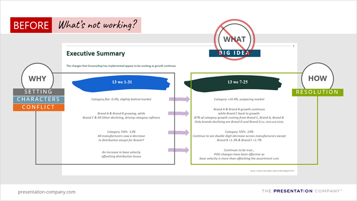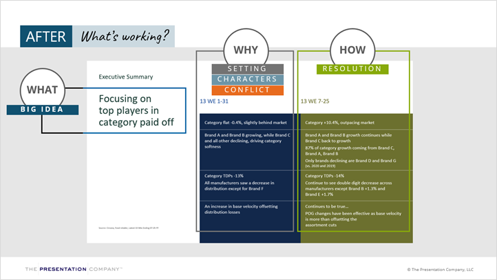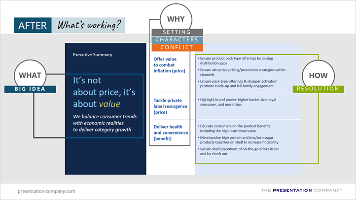 CPG leaders often struggle to highlight conflict in their presentations – whether it gets buried within slides or not shown at all. There’s a tendency to focus more on setting and characters while shying away from sharing conflict or challenges, due to the perception that it signifies a loss or failure. But the reality is, conflict is crucial because it gives you the chance to reveal opportunities and recommendations on how you’ll address it.