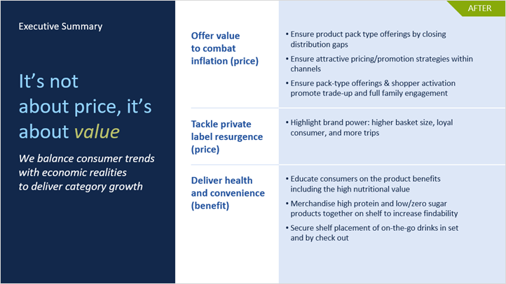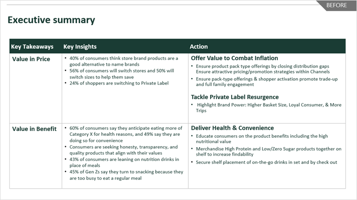 In the “before” version, the team focused on the “What, So What, Now What?” – which for them was a typical format for Executive Summaries. While all the content was there, it was difficult to pull out the key insights and call to action!