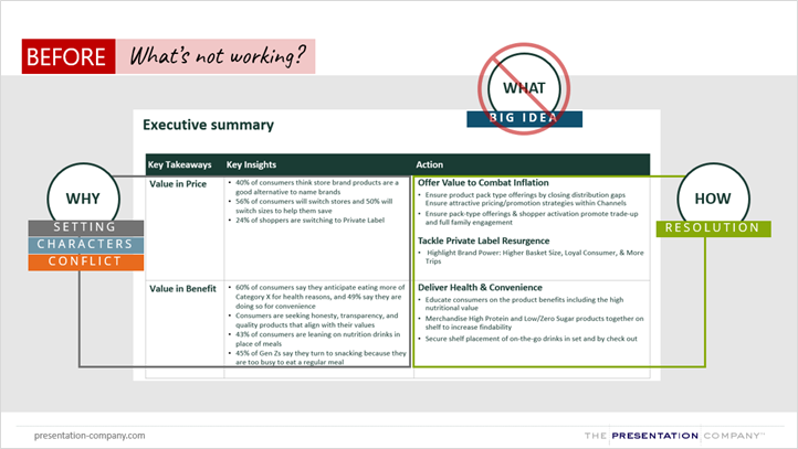 Notice how this made-over executive summary incorporates each storytelling element. The BIG Idea is on big, bold text on the left side of the page. Then on the right, we lead with the WHY, which establishes necessary context for the story. Finally, we have the HOW, or resolution. It’s also important to note that there is the main headline (blaring the BIG Idea) and another active sub-headline, working together to bring the story forward.